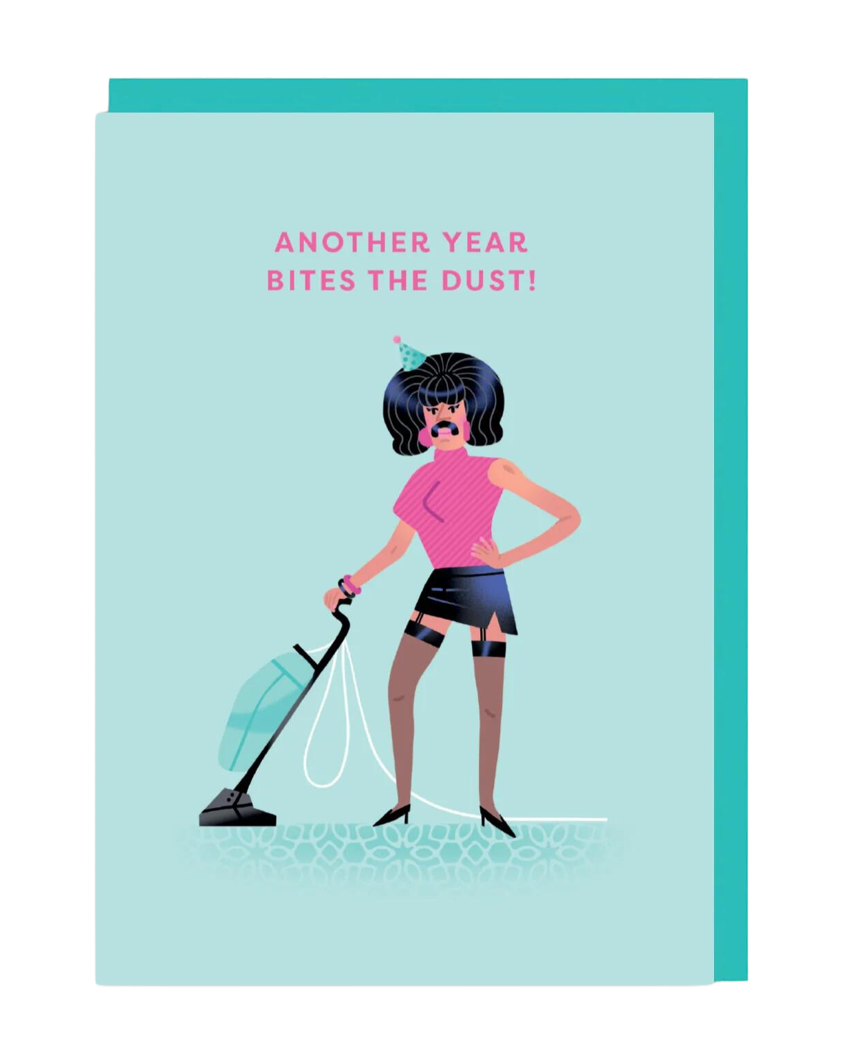 Celebrate a Freddie Mercury fans birthday with this iconic card, featuring an illustration of Freddie from the classic 'I Want to Break Free' video with the cheeky caption 'another year bites the dust'. Made in the UK, this card is perfect for all Queen fans.